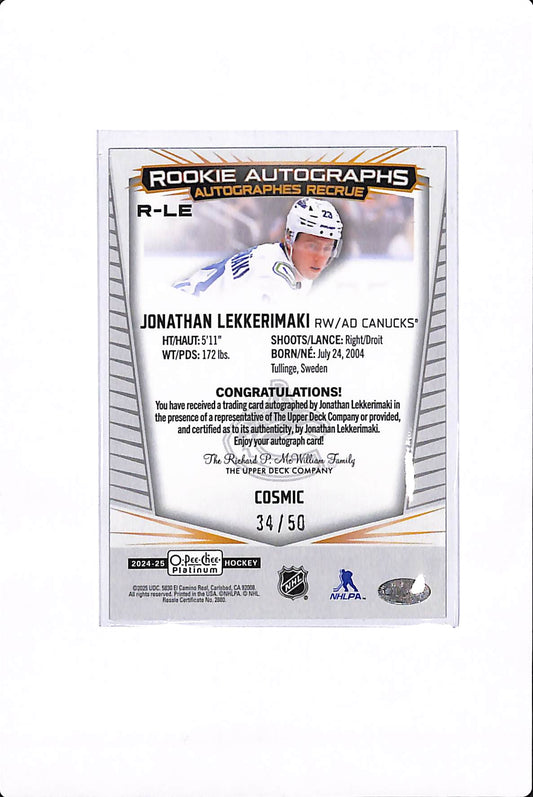 2024-25 UPPER DECK O-PEE-CHEE PLATINUM JONATHAN LEKKERIMAKI ROOKIE AUTO COSMIC /50 #R-LE