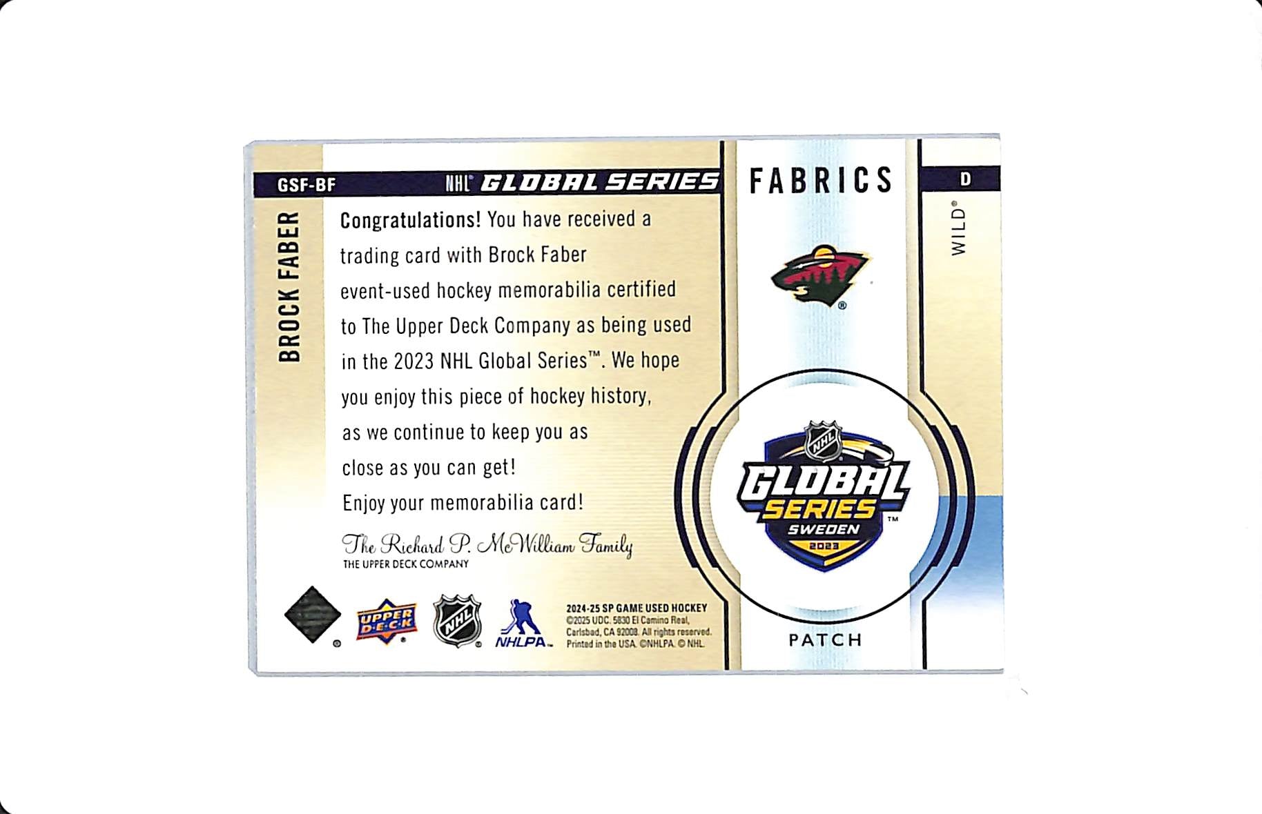 2023-24 UD SP GAME USED BROCK FABER GLOBAL SERIES FABRICS PATCH /35