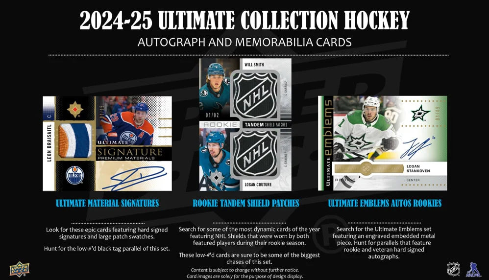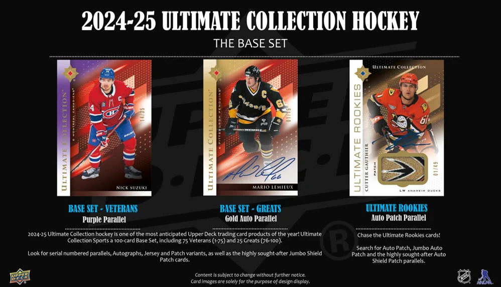 2024-25 Ultimate Collection hockey is one of the most anticipated Upper Deck trading card products of the year! Ultimate Collection Sports a 100-card Base Set, including 75 Veterans (1-75) and 25 Greats (76-100).